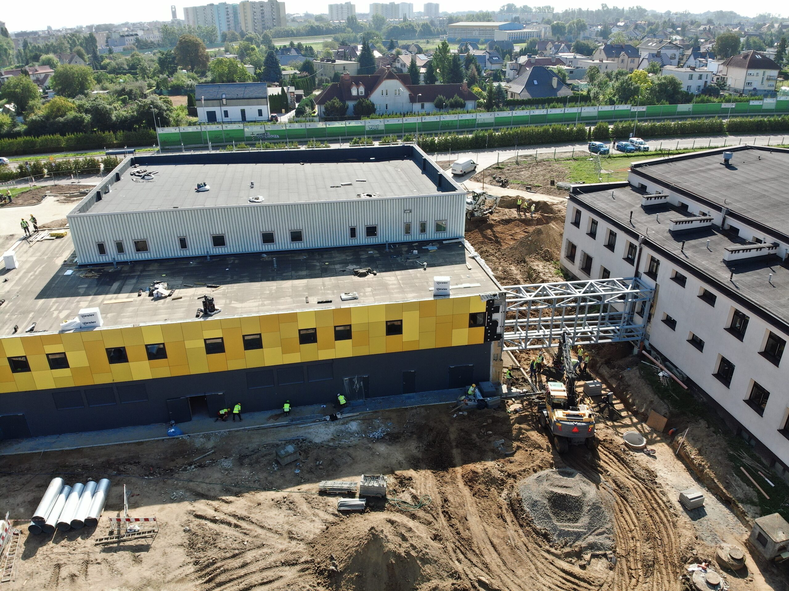 Rozpoczęły się prace przy obudowie łącznika między budynkiem Szkoły Podstawowej nr 12 a nowym basenem. Łącznik będzie przeszklony, umożliwi łatwe i bezpieczne przemieszczanie się uczniów szkoły na zajęcia na pływalni.