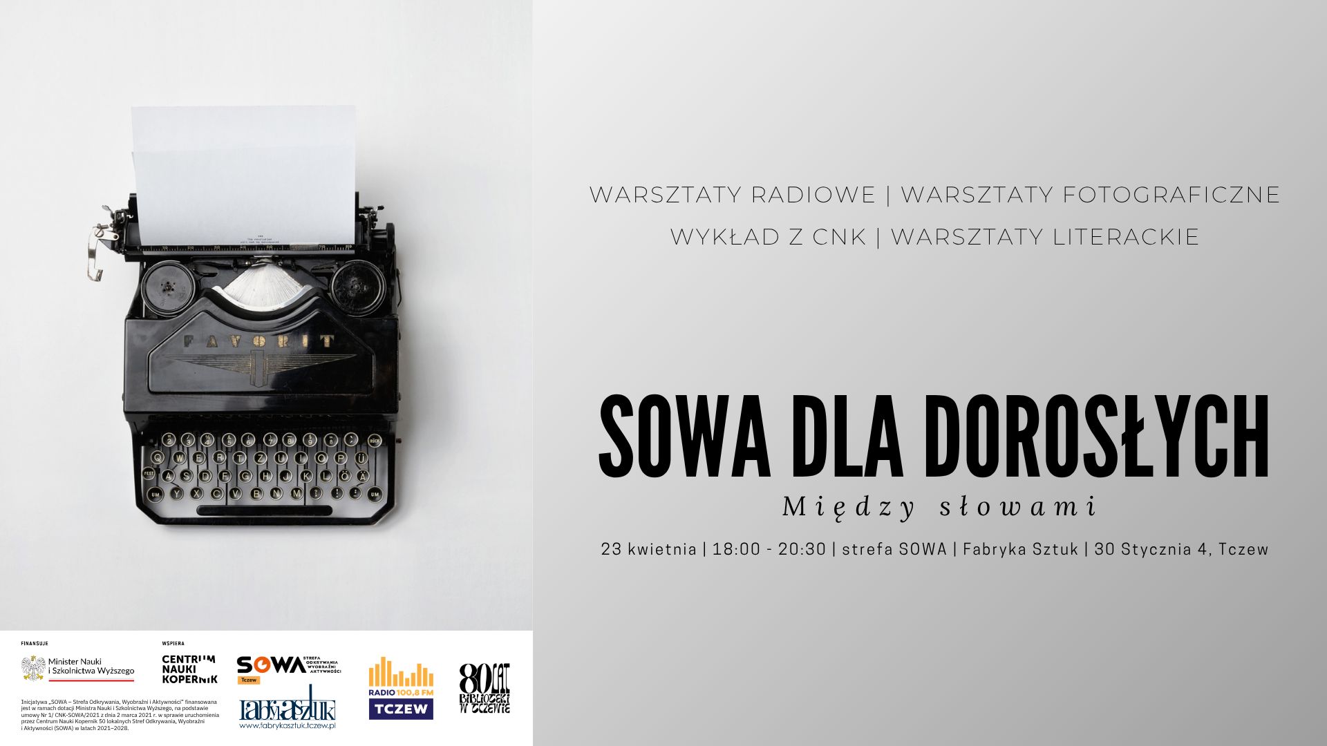 Inicjatywa „SOWA – Strefa Odkrywania, Wyobraźni i Aktywności” finansowana jest w ramach dotacji Ministra Nauki i Szkolnictwa Wyższego, na podstawie umowy Nr 1/CNK-SOWA/2021 z dnia 2 marca 2021 r. w sprawie uruchomienia przez Centrum Nauki Kopernik 50 lokalnych Stref Odkrywania, Wyobraźni i Aktywności (SOWA) w latach 2021-2028.